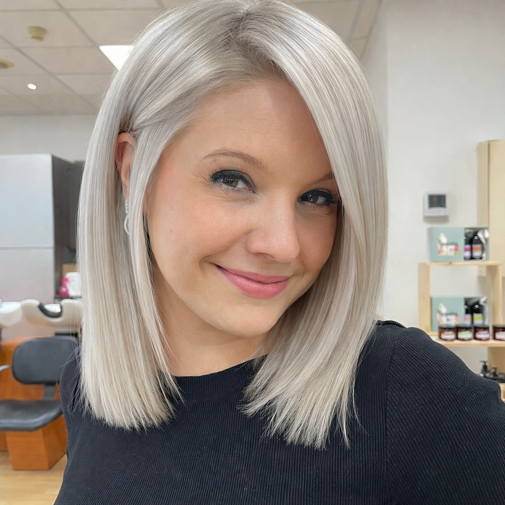 Un blond clair et moderne réalisé avec précision pour un rendu lumineux et élégant.